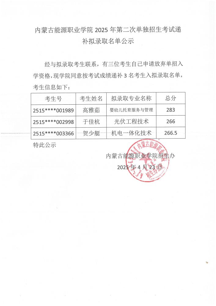 內(nèi)蒙古能源職業(yè)學(xué)院2025年第二次單獨(dú)招生考試遞補(bǔ)擬錄取名單公示